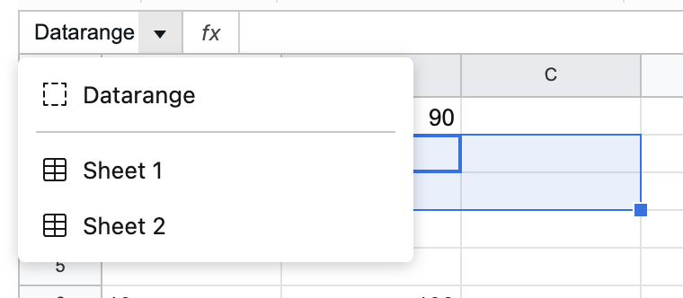 RangeSelector displays the currently selected cell address and creates a dropdown menu to select named ranges and sheets.